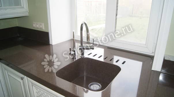 Кухонная раковина из камня имеет достаточную глубину для того, чтобы вместить в нее большие тарелки или вымыть фрукты. Габариты изделия позволяют организовать рациональное использование кухонного пространства. Модель представляет собой монолитное сооружение со столешницей. Протекание воды исключается благодаря полному отсутствию швов. Конструкцией также предусмотрены отверстия для стока и смесителя. Изделие не требует частого ухода, почти не поддаются механическим повреждениям, отлично переносит критические температуры, а также легко очищается от различных загрязнений.